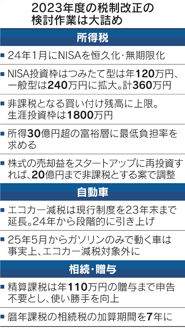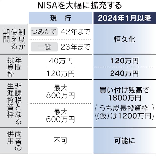 少額投資非課税制度(NISA)の投資枠が2024年から合計360万円に広がる。政府・与党はつみたて型の年間枠を現行の3倍の120万円、一般型は2倍の240万円に拡大する。制度の恒久化と非課税期間の無期限化とあわせ、貯蓄から投資の流れを加速する。