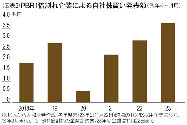 各年3月末時点でPBR(株価純資産倍率)が1倍を下回る企業による自社株買い発表額(4〜11月)を比較すると、23年度はこの6年間で最大となりました(図表2)。東証の要請がPBR1倍割れ企業の行動に影響を与えた可能性は高いと考えられます。