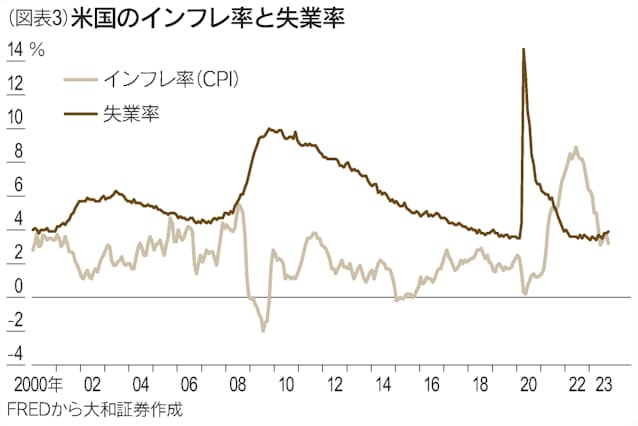 最後の3つ目の力は、米国の経済軟着陸と長期金利の低下です。23年末の米インフレ率は22年末比で4ポイント近く低下する見込みの一方、失業率は10月時点で3.9%と歴史的な低水準にとどまっています(図表3)。大幅な失業率上昇を回避しながらインフレ率が低下するという意味で、米経済は軟着陸に成功しつつあります。
