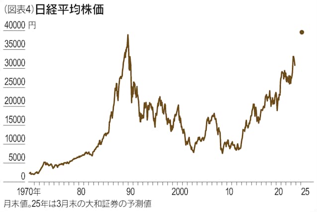 日本のゼロインフレ脱却、日本企業の経営改善の広がり、米経済の軟着陸成功、という3つの力が重なれば、日本企業は25年度にかけて最高益を更新する公算が大きいと考えられます。米長期金利の低下も、日本株のPER(株価収益率)を押し上げるでしょう。こうした点が原動力となり、24年度末までに日経平均株価は史上最高値を上回ると予想しています(図表4)。