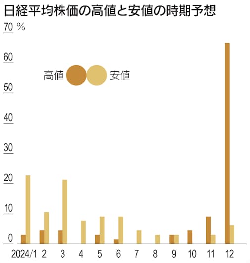 市場関係者66人の24年の日経平均株価の予想によると、高値平均は3万6971円、安値平均は3万0599円だった。高値をつける時期は12月との予想が7割と最多だった。回答者の2割にあたる13人が1989年12月につけた史上最高値(3万8915円)を超えると予想した。