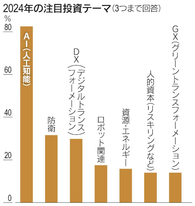 「生成AIがもう一段盛り上がる」(りそなアセットマネジメントの黒瀬浩一チーフ・ストラテジスト)との予想も見逃せない。注目の投資テーマでは8割が「AI」と回答した。2位の「防衛」、3位の「デジタルトランスフォーメーション(DX)」を50ポイント以上引き離した。