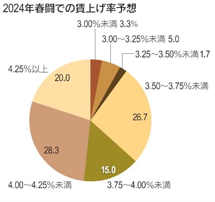 予想の平均は3.94%となった。23年の賃上げ率(3.58%)を超えるとの見方が大勢で、「4%以上」と回答した割合も5割近くにのぼった。SMBC信託銀行の山口真弘投資調査部長は「春闘での賃上げに伴い、実質賃金の伸びがプラスに転じる。インフレが企業業績の改善につながる」とみる。