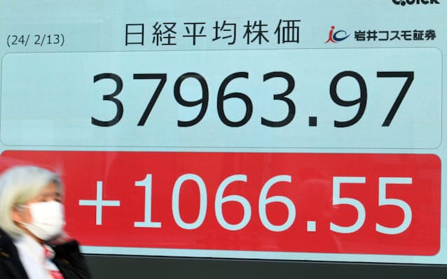 13日の東京株式市場で日経平均株価は大幅続伸し、前週末比1066円(2.9%)高の3万7963円で終えた。前営業日比の上げ幅は2020年3月25日以来、3年11カ月ぶりの大きさ。取引終了直前には一時3万8000円を上回る場面もあった。前日の米株高を受けて投資家がリスク選好姿勢を強め、東京市場でも半導体関連を中心に幅広い銘柄に買いが入った。