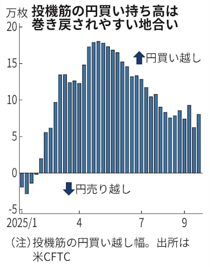 年明け以降、ヘッジファンドなど非商業部門は日銀の利上げ観測をよりどころに、円を大幅に買い越してきた。米商品先物取引委員会(CFTC)によると、直近9月23日時点の買い越し幅は7万9500枚(9937億円)に達した。利上げ観測の後退や政局の混乱で、投機筋は持ち高の解消売りを出しやすい環境になっている。