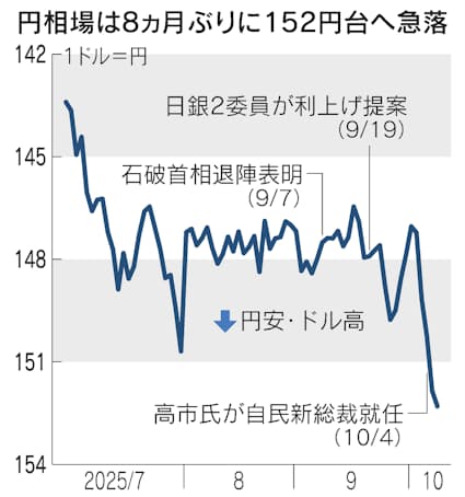 円売り圧力「政治空白」で増幅 円152円台、急落の歯止め乏しく